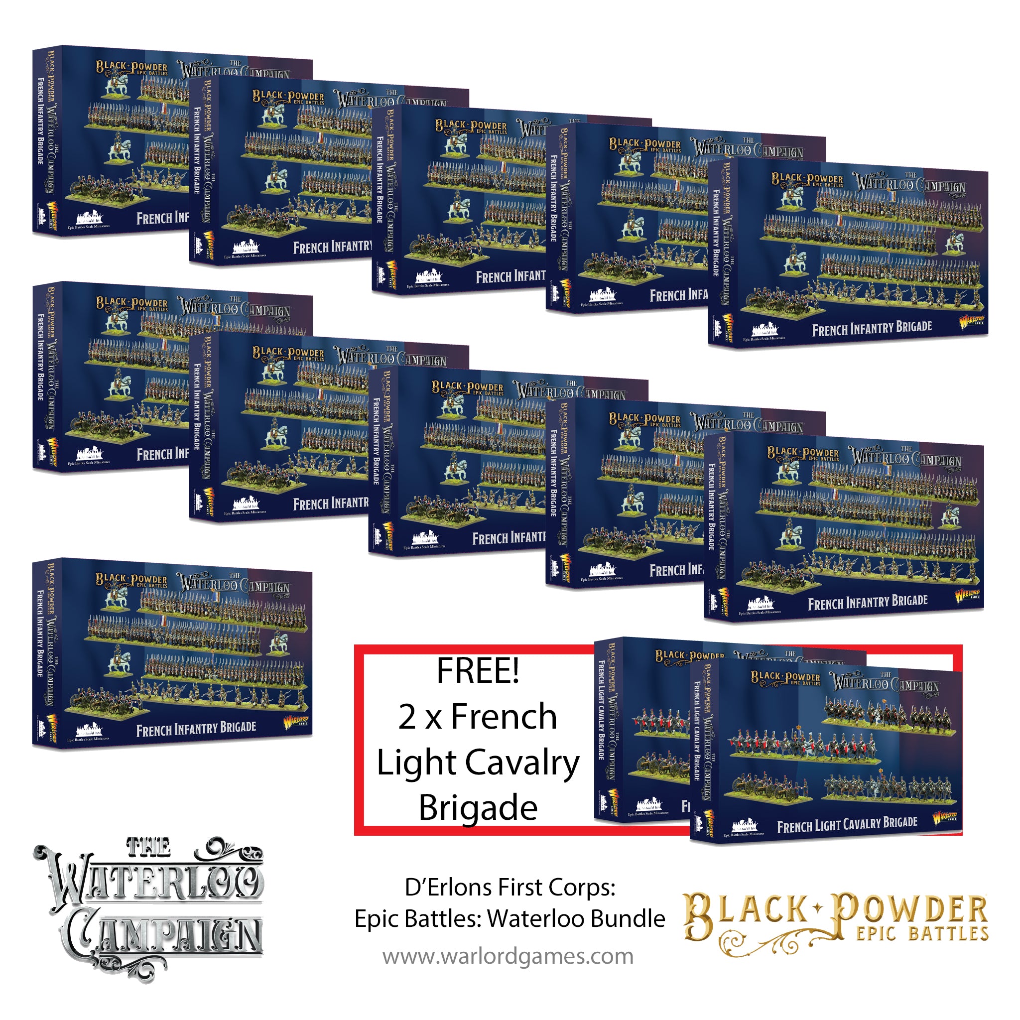 For those of you who feel they would like to fight Waterloo on a truly epic scale, then we offer you the chance to get all of the 1st Corps in one bundle package. 11 Infantry brigade box sets and 2 light cavalry box sets will give you everything you need to recreate this iconic formation.