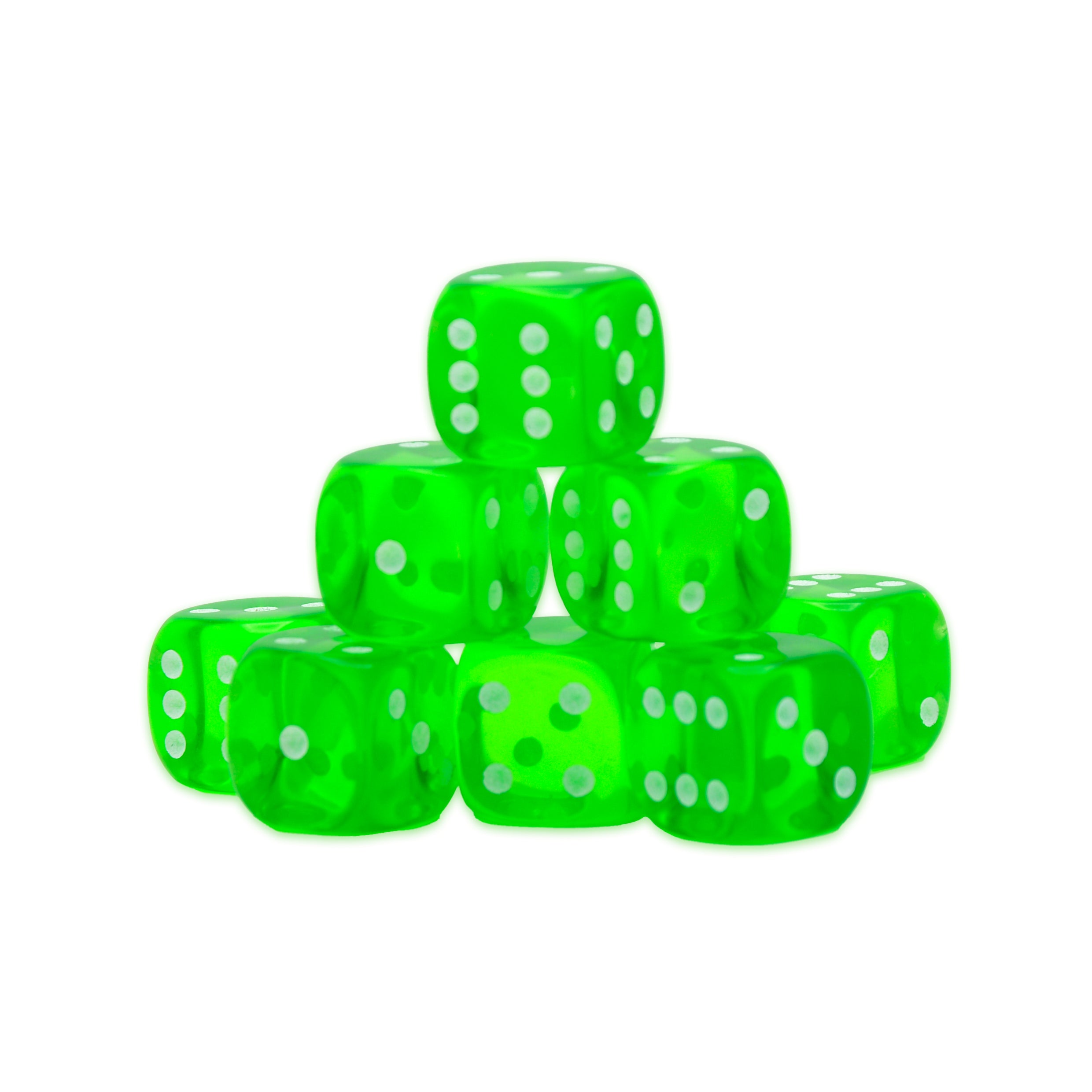 This pack contains eight emerald six-sided dice (D6) with white spots