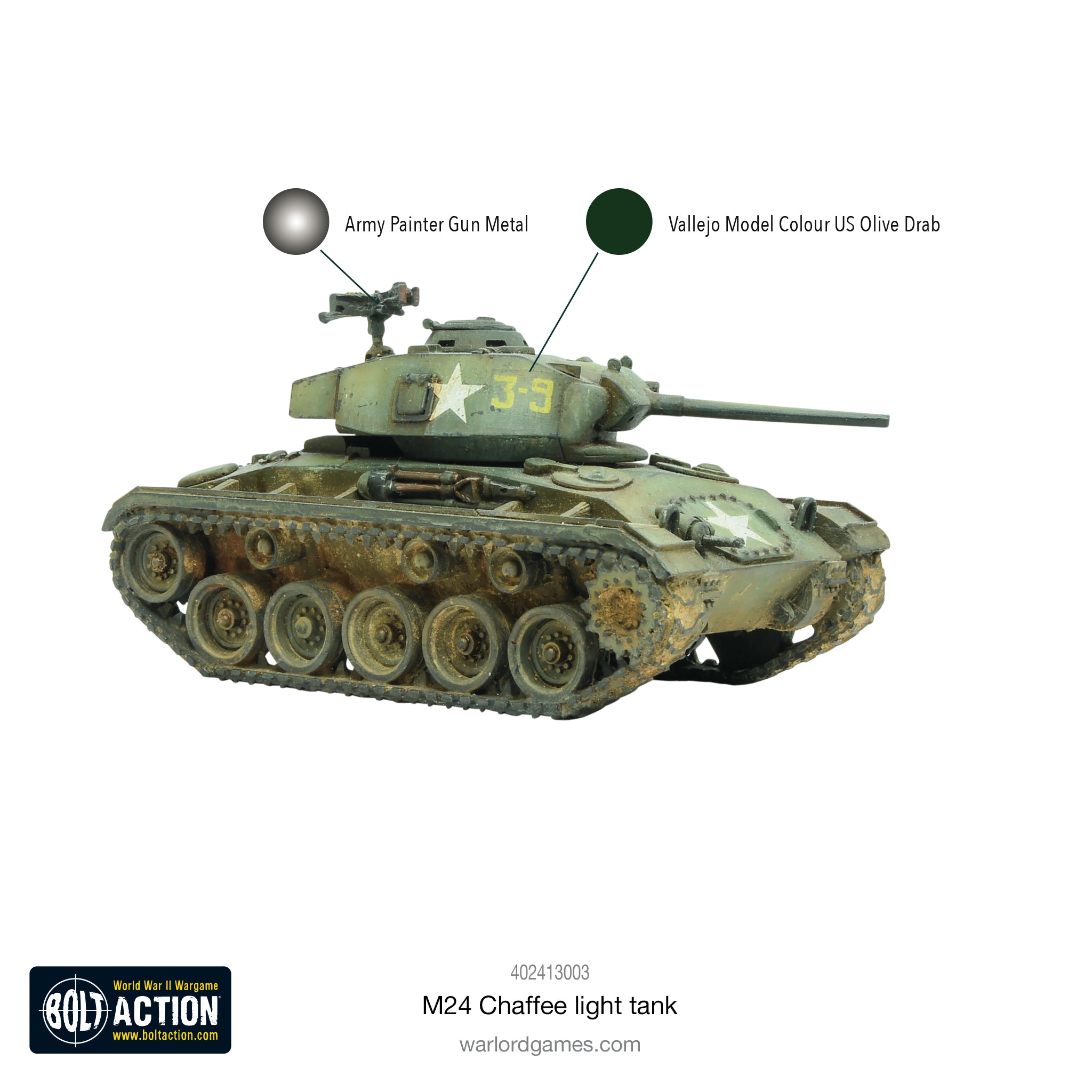 Box contains one resin and metal M24 Chaffee light tank, order dice, waterslide decals and game accessories.