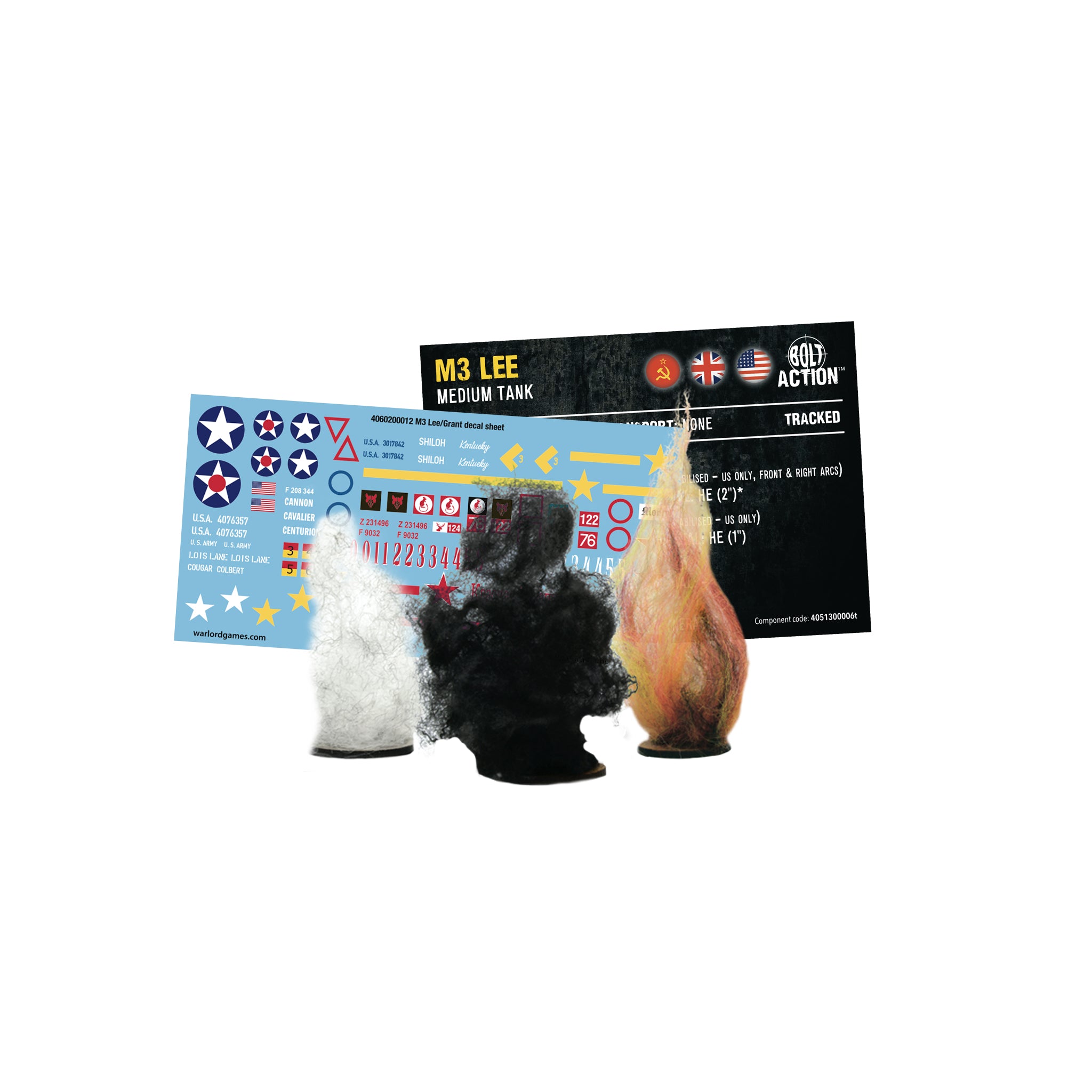 Box contains one plastic M3 Lee medium tank, decal sheet, Bolt Action vehicle stat card, and vehicle damage markers.