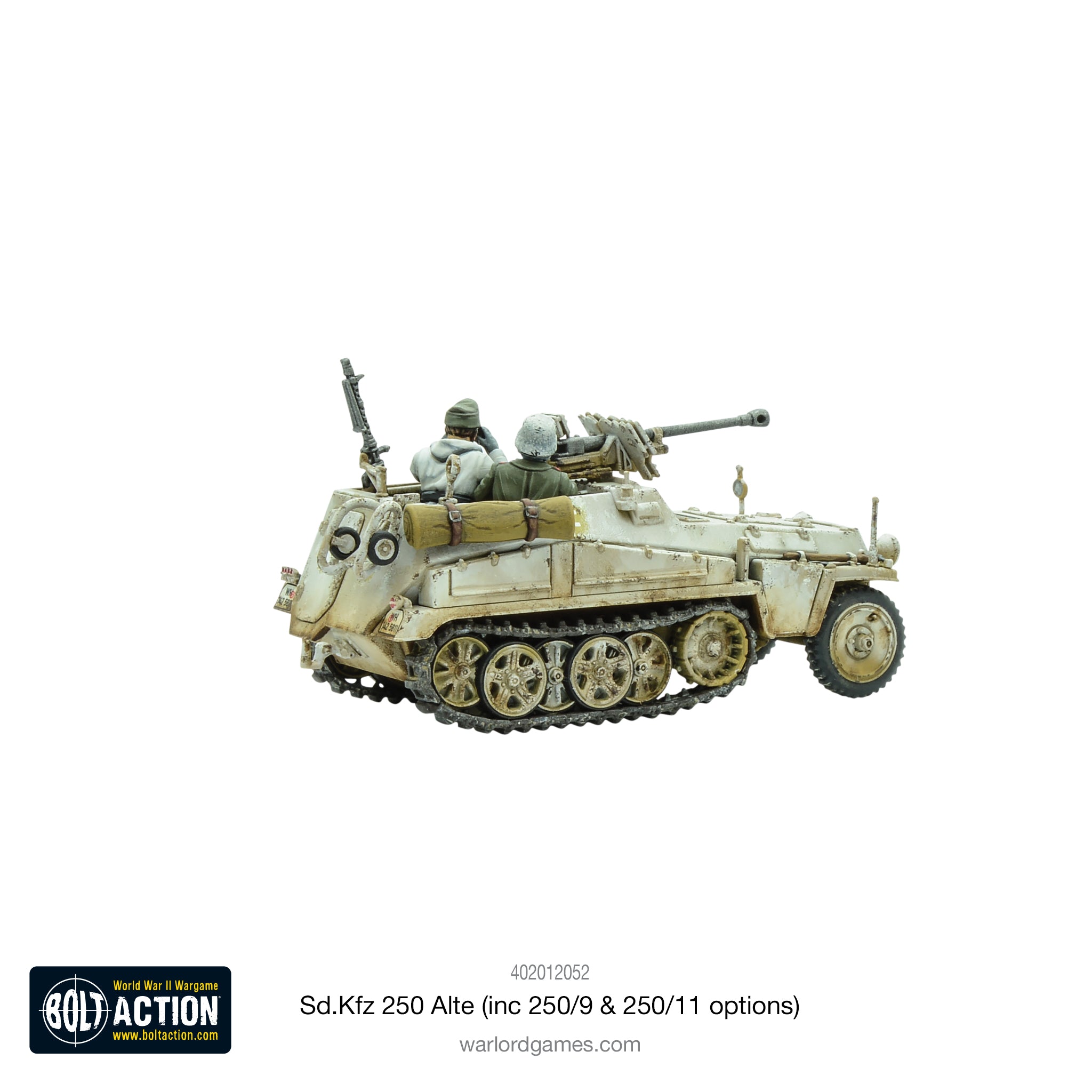The Sd.Kfz 250/1 was a reconnaissance and transport half-track mainly used by scout and HQ units. The vehicle was a shortened version of the ubiquitous Sd.Kfz 251 Hanomag series and much like its longer cousin there were many variants fulfilling different roles, such as cable carriers, ammunition carriers and radio carriers, amongst others. It carried six men including the driver and the co-driver and was armed with two pintle-mounted MG34 machine guns, one shielded forward facing and the other covering the rear and air.