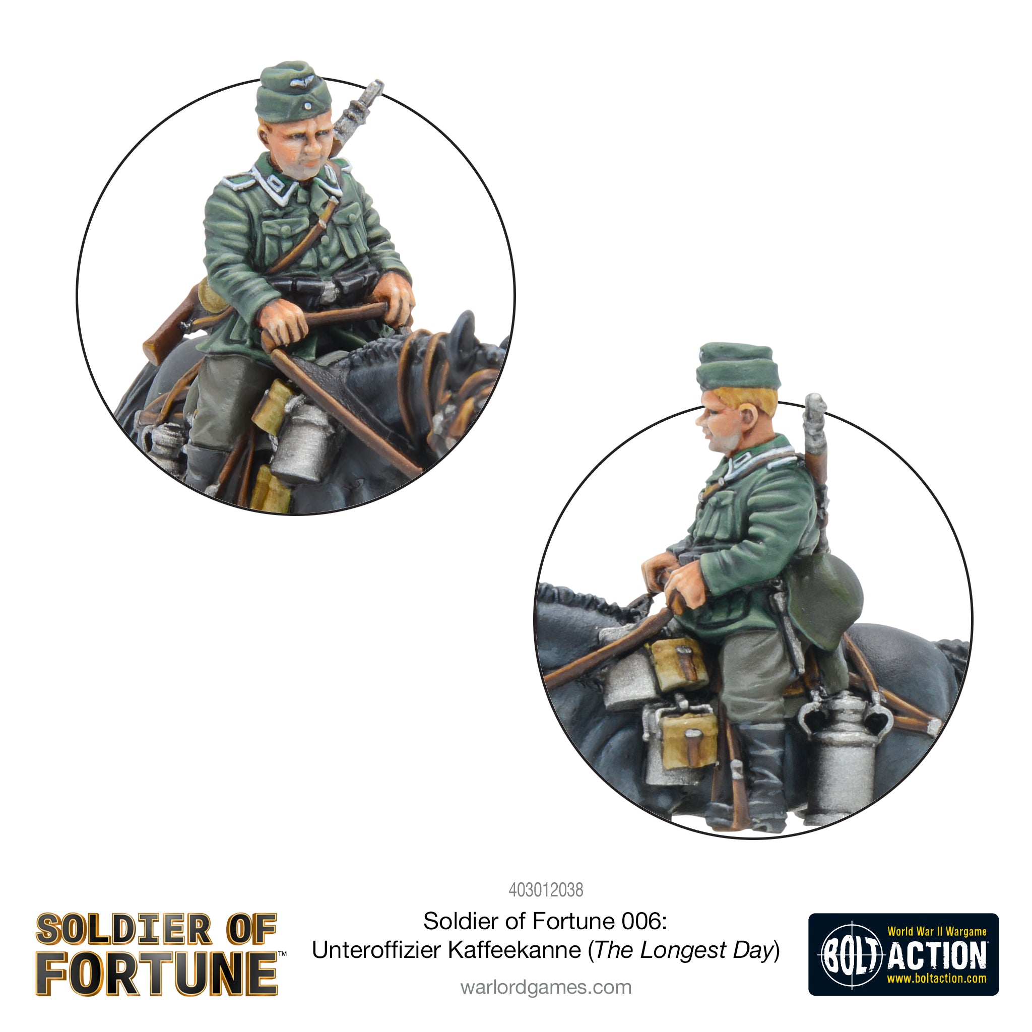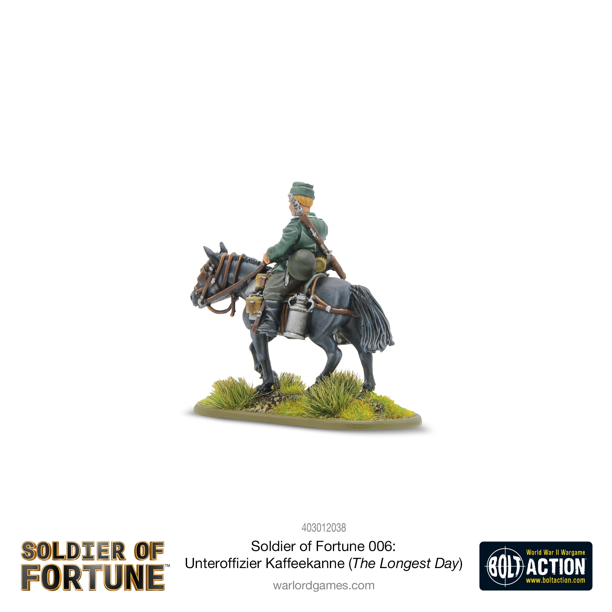 Mounted on his faithful steed, and with his rifle slung (he's on invasion watch, after all!), the slightly rotund Kaffeekanne is out on the morning coffee run for his comrades, and has had the misfortune to end up under the guns of the Allies! If you've seen The Longest Day (and if you haven't, go watch it right now!), you'll know exactly how unlucky this chap is, but we reckon he'll have more luck on the Bolt Action tabletop, where he'll make for a great mounted officer, addition to your cavalry squad, or (for the more competitive types) perhaps even part of a horse or mule towing team!